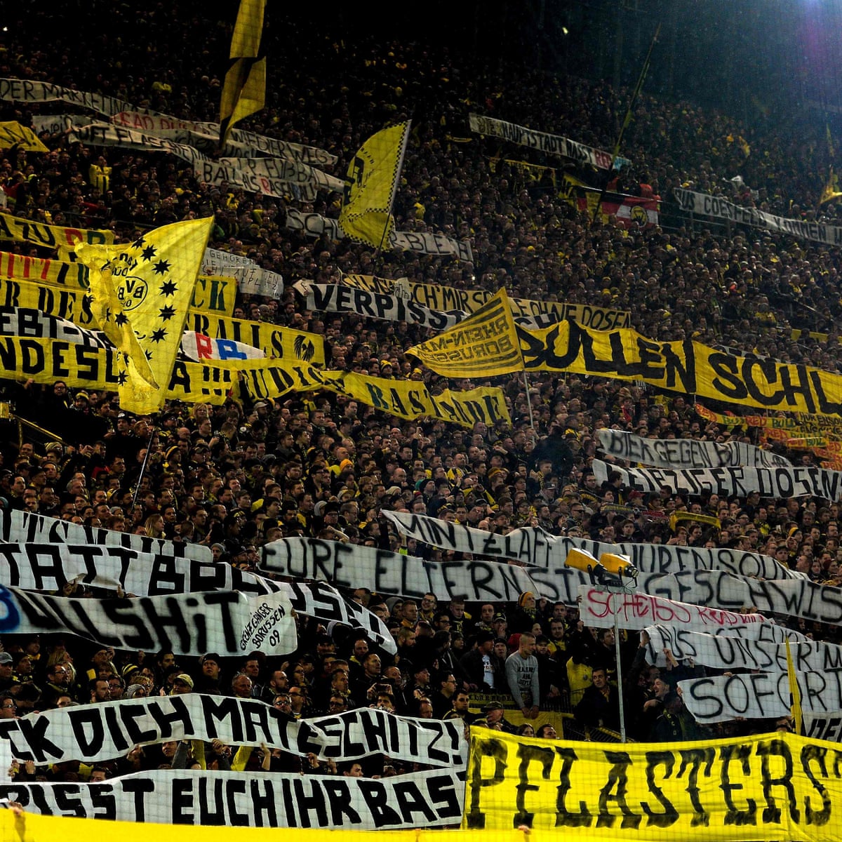 Dortmund were given a 50000 fine plus a suspended three-game away fans ban for matches at Hoffenheim two years ago after supporters abused the home clubs owner Hopp by displaying offensive. Borussia Dortmund fans banned after combat cache discovered Bundesliga stadium bans have been imposed on 88 Dortmund fans for two years after police found them in possession of combat equipment.